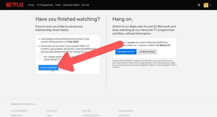 A Netflix egy megerősítő oldalt jelenít meg, amely felvázolja, hogy mikor ér véget a számlázás, és mi történik az adataival. Ha megerősíti ezt a képernyőt, akkor az előfizetés hivatalosan leáll.