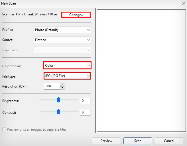 Klik tombol Ubah di jendela pindai baru dan pilih printer Canon Anda. Lakukan perubahan yang diperlukan pada preferensi pemindaian seperti Format warna dan Jenis file.