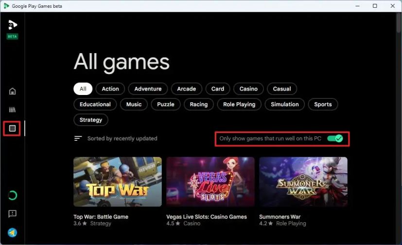 Google Play Games adalah aplikasi dari Google yang secara resmi memungkinkan untuk memainkan game Android di Windows. Aplikasi ini menggunakan lapisan virtualisasi yang memungkinkan game dari berbagai platform berjalan di Windows 11 atau 10. Aplikasi Google Play Games masih berupa pratinjau sebagai unduhan beta yang memberi Anda akses ke banyak game, seperti 1945 Air Force, Blade Idle , Cookie Run: Kerajaan, dan Evony: Kembalinya Sang Raja. Katalog hanya memiliki beberapa game, tetapi Google akan terus menambahkan lebih banyak judul.