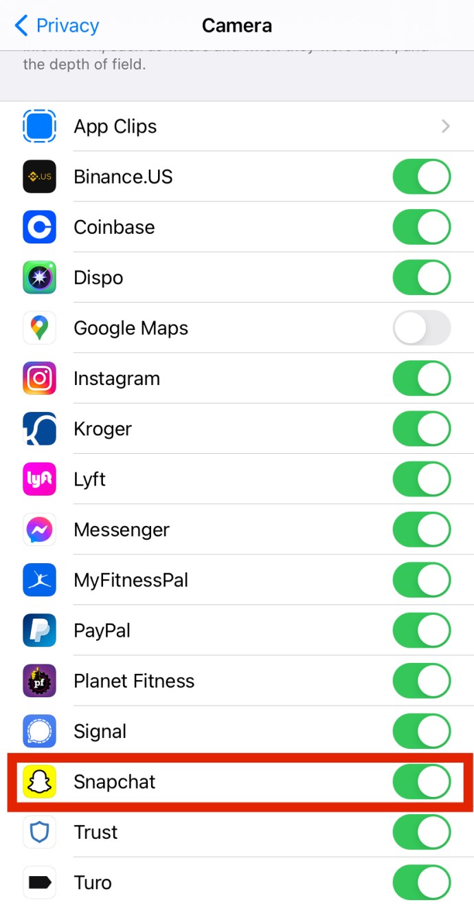 Di bawah Privasi, Anda akan melihat opsi untuk Kamera dan opsi untuk Foto. Klik masing-masing dan verifikasi bahwa Snapchat diaktifkan.