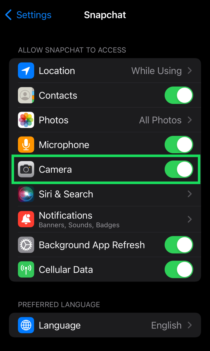 Izinkan Kamera di Pengaturan untuk Snapchat di iPhone