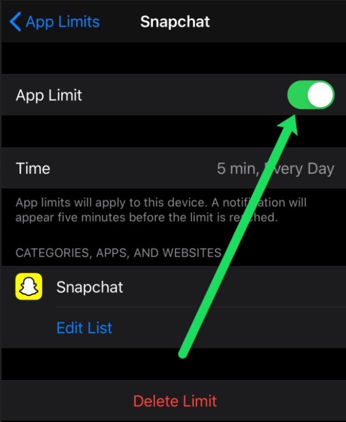 Langkah-langkah di atas biasanya berhasil. Terkadang, pengguna iOS mengalami masalah bahkan setelah mengikuti langkah-langkah ini. Salah satu penyebab potensial dari masalah ini adalah batas aplikasi pada aplikasi Snapchat Anda, yang berarti itu akan mengatur waktu penggunaan Anda.