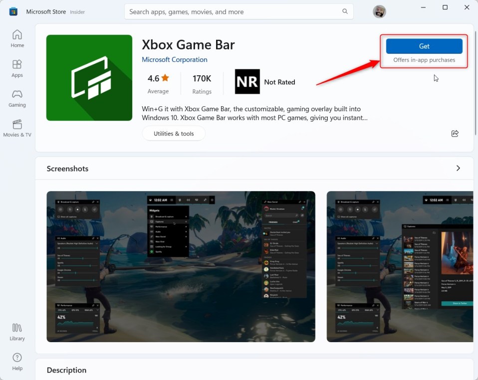Klik tombol Dapatkan atau Instal pada halaman Game Bar di aplikasi Microsoft Store.