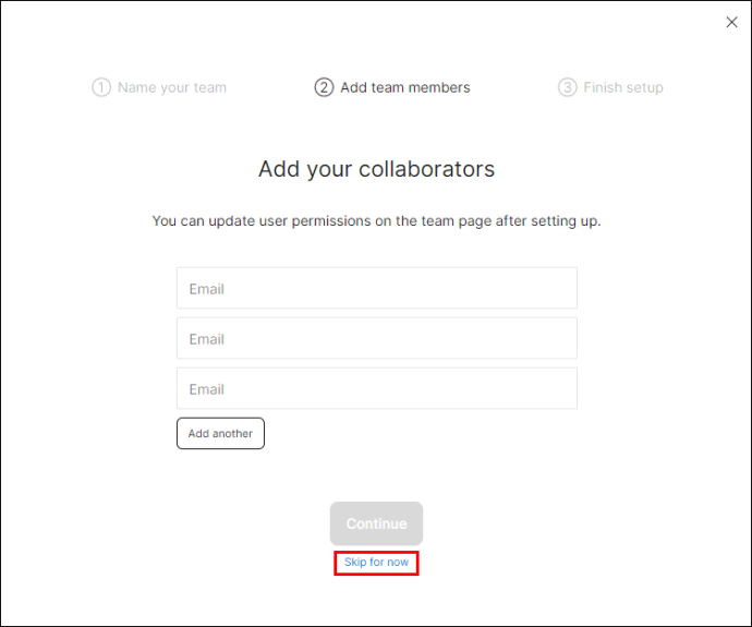 Undang kolaborator yang Anda inginkan untuk menjadi anggota tim dengan memasukkan alamat email mereka. Atau, pilih “Lewati untuk sekarang.”