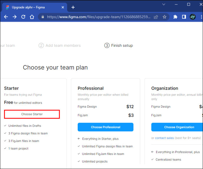 Pilih paket untuk tim antara opsi Pemula, Profesional, dan Pendidikan.