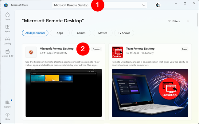 The Aplikasi Microsoft Remote Desktop tidak ada secara default di Windows 11 dan Windows 10, jadi Anda harus menginstalnya secara manual. Untuk mendapatkannya, klik atau ketuk tautan ini atau buka Microsoft Store, cari”remote desktop”, dan klik atau ketuk aplikasi Microsoft Remote Desktop di daftar hasil.