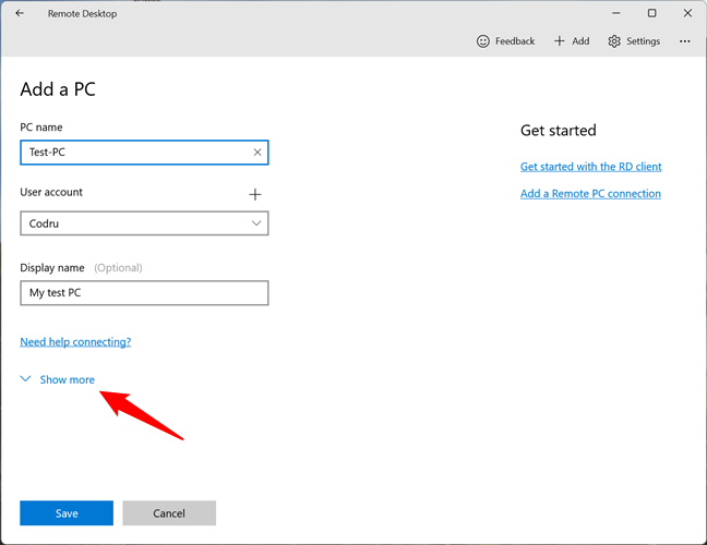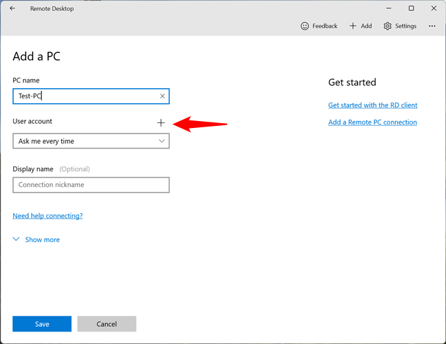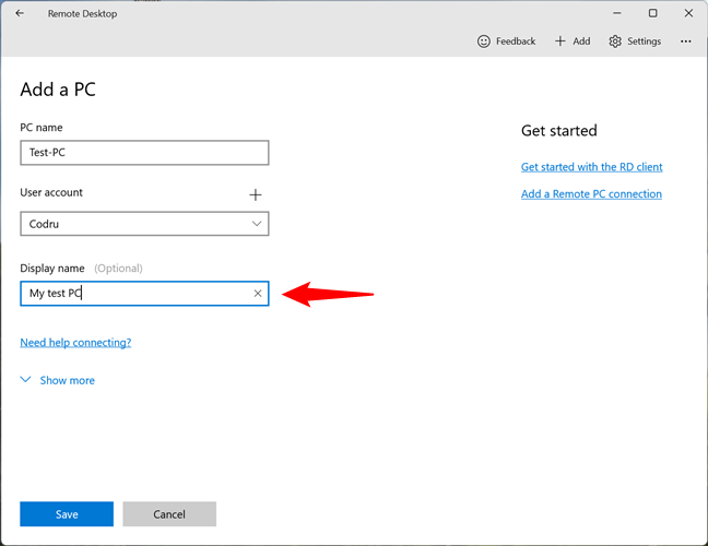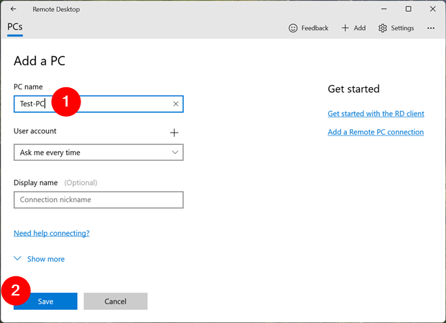Masukkan nama komputer target (dalam kasus saya, Test-PC) atau alamat IP-nya ke dalam bidang teks nama PC. Perhatikan bahwa Anda juga dapat menentukan port yang akan digunakan, seperti OfficePC:37770. Itu saja yang Anda perlukan untuk mengonfigurasi koneksi desktop jarak jauh ke komputer Windows lain, jadi Anda cukup mengeklik atau mengetuk Simpan.