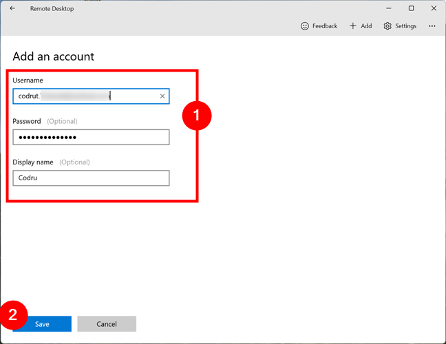 Anda dapat memasukkan nama akun pengguna dalam format berikut: nama pengguna, domain\nama pengguna, atau [dilindungi email]. Jika Anda ingin terhubung lebih cepat, Anda juga dapat menentukan kata sandi pengguna di bidang Kata Sandi. Selanjutnya, untuk pengalaman yang lebih ramah, Anda dapat mengetik nama panggilan untuk akun pengguna tersebut di bidang Nama tampilan.