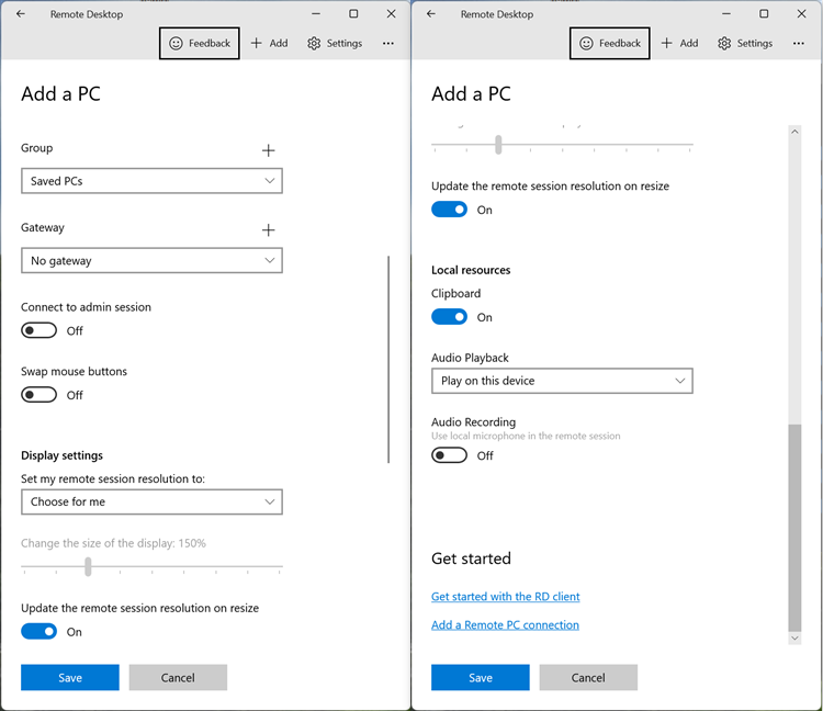 Sumber daya lokal: Clipboard: jika diaktifkan, Anda dapat menyalin dan menempelkan item antara PC jarak jauh dan komputer Windows 11 dan Windows 10 Anda. Pemutaran Audio: memungkinkan Anda memilih perangkat audio yang digunakan saat sesi sambungan jarak jauh aktif. Anda dapat memilih untuk memutar suara dari komputer jarak jauh di PC Windows 11/Windows 10 Anda, di komputer jarak jauh, atau di keduanya. Perekaman Audio: jika Anda mengaktifkan setelan ini, Anda dapat menggunakan mikrofon di komputer Windows 11 dan Windows 10 di PC jarak jauh.