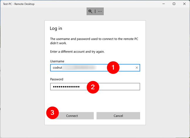 Kemudian, aplikasi akan terhubung dengannya dan, kecuali Anda telah mengonfigurasi pengguna akun untuk itu, meminta Anda untuk kredensial. Ketik kredensial perangkat yang Anda sambungkan dan tekan Hubungkan.