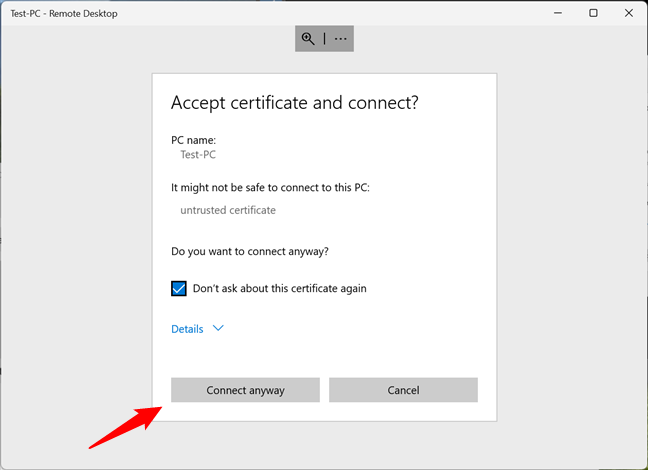 Jika Anda tidak ingin melihat peringatan ini setiap kali Anda terhubung dari jarak jauh, centang opsi yang mengatakan”Jangan tanya tentang sertifikat ini lagi.”Lalu, untuk memulai koneksi jarak jauh, klik atau ketuk Tetap terhubung.