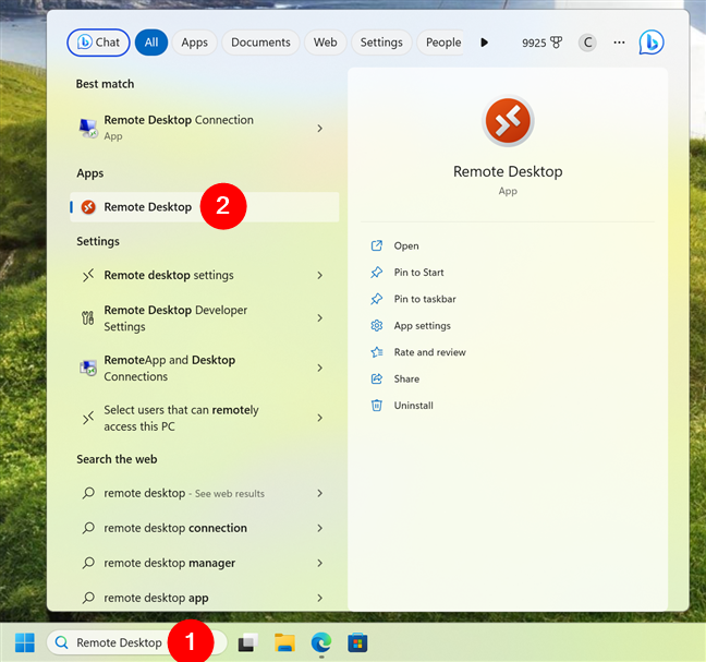 Cara tercepat untuk membuka apa pun di Windows 11 adalah dengan menggunakan pencarian. Itu juga berlaku untuk aplikasi Microsoft Remote Desktop: ketik”remote desktop”di kotak pencarian di bilah tugas Anda, pilih aplikasi Remote Desktop, lalu klik atau ketuk Buka.