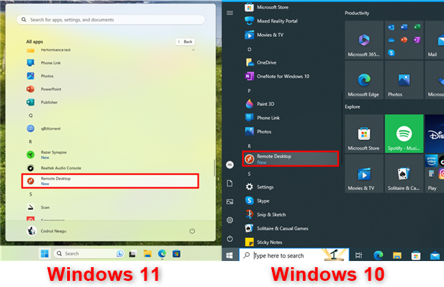 Atau, metode lain yang berfungsi sama di Windows 11 dan Windows 10 adalah membuka Start Menu dan mengeklik atau mengetuk pintasan Desktop Jarak Jauh di daftar aplikasi.
