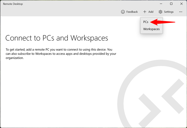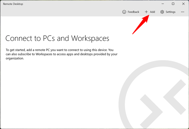 Untuk terhubung ke komputer jarak jauh, klik atau ketuk + Tambahkan di sudut kanan atas Microsoft Remote Desktop klien.