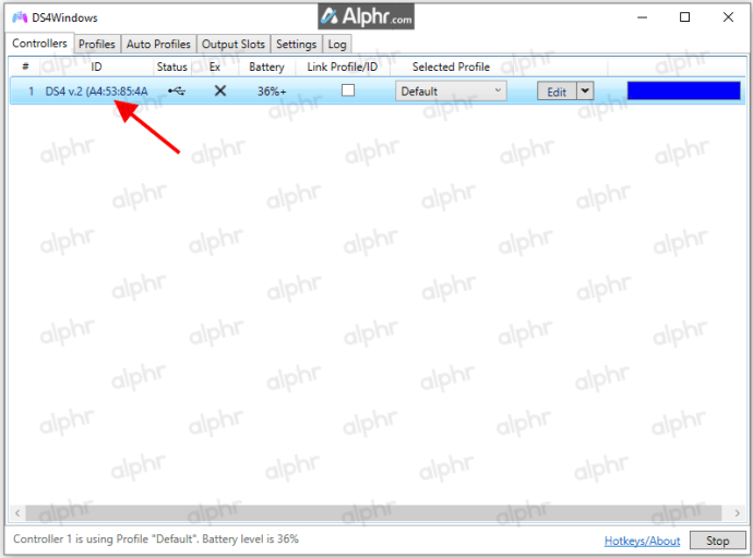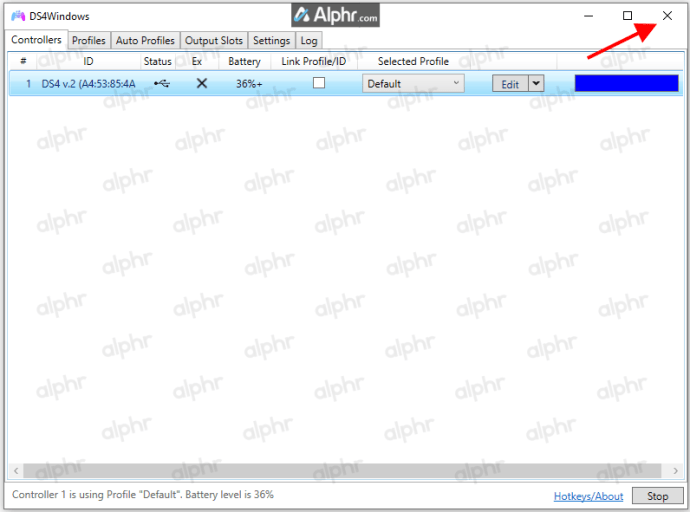 Luncurkan “DS4Windows.” Pengontrol Anda seharusnya sudah terdeteksi.Putuskan sambungan pengontrol Anda dan matikan “ DS4Windows.”