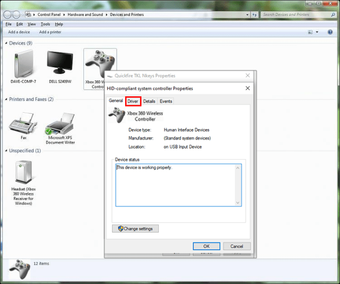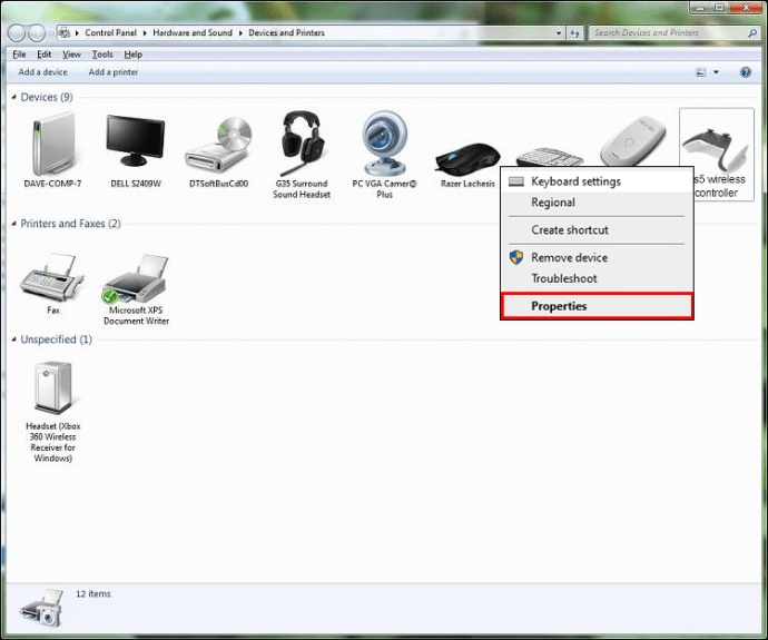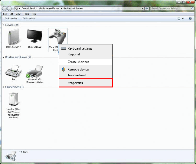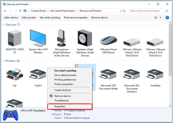 Ikon gamepad muncul di layar”Perangkat dan Printer”. Klik kanan padanya dan pilih “Properties” dari menu drop-down.