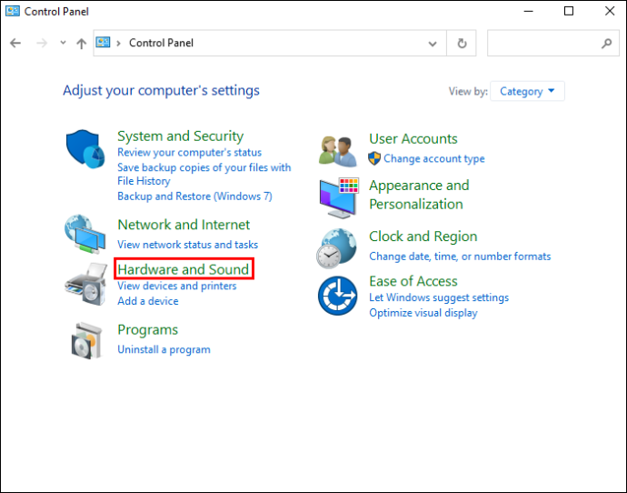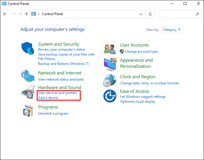 Temukan “Perangkat Keras dan Suara”dan klik “Lihat perangkat dan printer.”