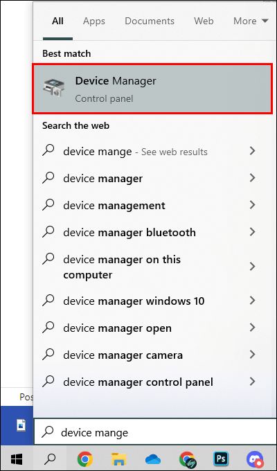 Putuskan sambungan pengontrol dari PC dan tutup DS4Windows.Dari “Bilah Pencarian”, ketik “Pengelola Perangkat” dan klik untuk membuka.