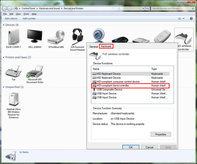 Hubungkan kembali pengontrol DS4Windows Anda.Ikon gamepad muncul di layar”Perangkat dan Pencetak”. Klik kanan pada “PS5 wireless controller” atau apa pun yang tertulis, dan pilih “Properties.”