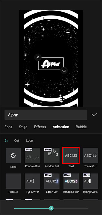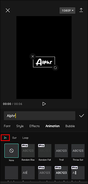 Saat menambahkan teks ke foto atau video, ketuk “Animasi”di menu teks.Ada ada tiga opsi: “Masuk”, “Keluar”, dan “Ulang”. Pilih satu untuk melanjutkan.