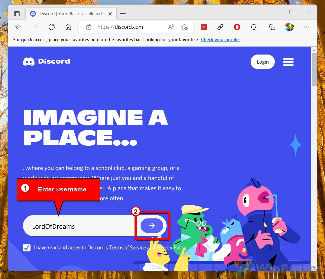 Masukkan nama pengguna Discord Anda dan klik tombol untuk masuk di