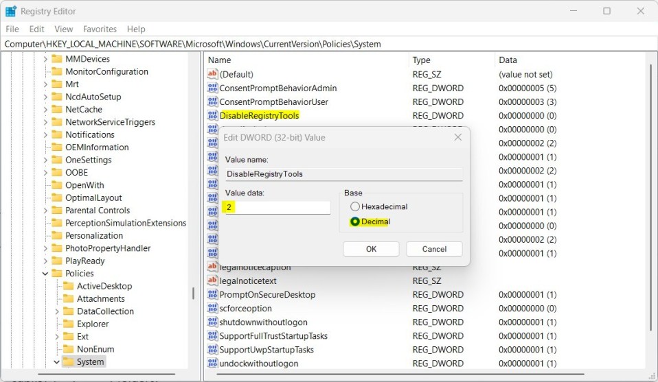 Klik dua kali nama item kunci baru (DisableRegistryTools) dan pastikan Base opsinya adalah Desimal, lalu perbarui Data nilai: