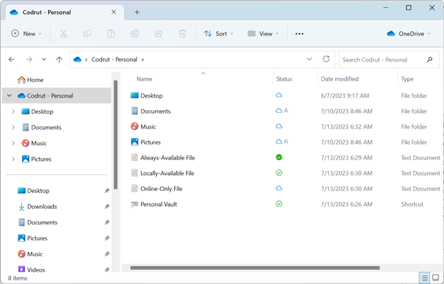 Di File Explorer, file dan folder dari OneDrive memiliki indikator status yang berbeda bergantung pada tempat penyimpanannya: