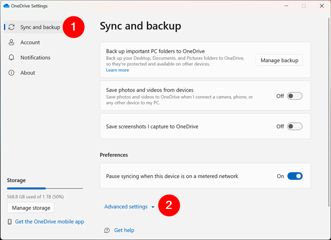 Mengklik atau mengetuk Pengaturan akan meluncurkan jendela Pengaturan OneDrive. Di sini, pilih”Sinkronkan dan cadangkan”di sidebar kiri, lalu klik atau ketuk Pengaturan lanjutan di bagian bawah panel kanan.