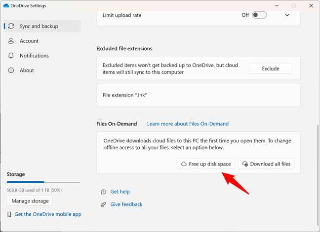 Klik atau ketuk tombol Kosongkan ruang disk di Pengaturan OneDrive