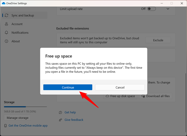 OneDrive memungkinkan Anda Ketahuilah bahwa jika Anda memilih untuk mengosongkan ruang di komputer dengan menjadikan semua file hanya online, Anda memerlukan akses internet saat mencoba membuka file yang disimpan di OneDrive. Jika Anda yakin itu yang Anda inginkan, tekan Lanjutkan untuk mengonfirmasi tindakan.
