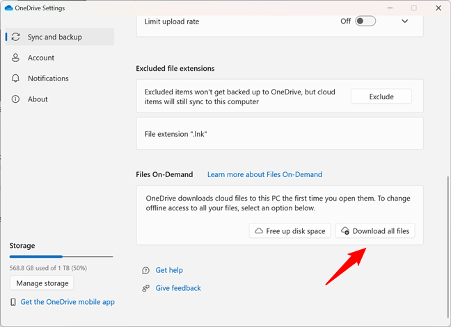 Gulir jika Anda perlu melihat semua pengaturan Lanjutan. Di bagian bawah daftar, Anda akan menemukan bagian bernama File Sesuai Permintaan. Bagian ini memiliki dua tombol: Kosongkan ruang disk dan Unduh semua file.