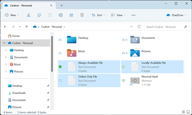 Beginilah tampilan tiga status untuk File Sesuai Permintaan di File Explorer Windows 11: