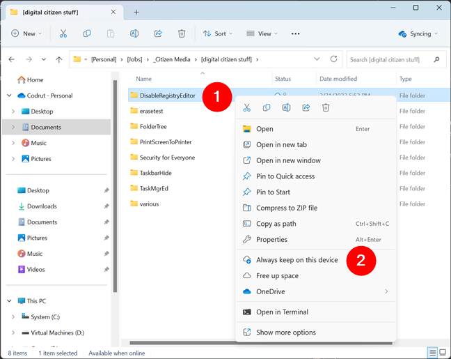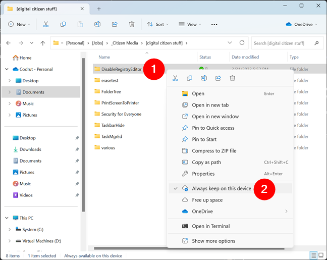Di File Explorer, navigasikan ke OneDrive Anda dan temukan folder atau file yang dimaksud. Kemudian, klik kanan pada mereka (atau tekan dan tahan jika Anda memiliki layar sentuh) dan pilih”Selalu simpan di perangkat ini”agar selalu tersedia secara lokal.