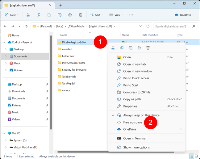 Untuk mengonfigurasi beberapa (atau bahkan semua) file atau folder agar tersedia hanya saat Anda online, buka File Explorer, navigasikan ke OneDrive Anda, lalu temukan file atau folder yang ingin Anda jadikan hanya tersedia online. Pilih mereka dan kemudian klik kanan pada mereka (atau tekan dan tahan jika Anda memiliki layar sentuh). Di menu kontekstual, klik atau ketuk opsi yang disebut “Kosongkan ruang”.