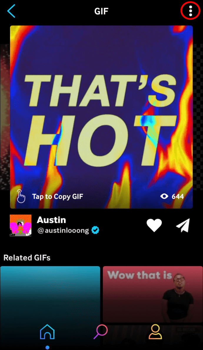 Buka tautan gambar langsung di platform GIF pilihan Anda. Kami menggunakan GIPHY sebagai contoh.|Ketuk ikon tiga titik di sudut kanan atas.