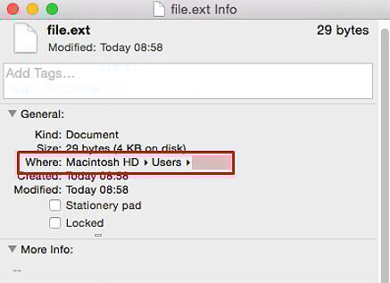 Klik kanan pada file tersebut.Klik Dapatkan Info.Pada kotak pop-up, cari Di mana bagian.Selain Di mana, Anda akan melihat jalur asli file Anda.