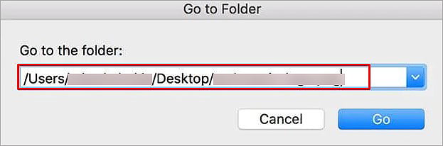Buka Finder.Dari bilah menu, pilih Buka > Buka Folder. Sekarang, seret dan lepas file terkait di dalam jendela Buka Folder. Sekarang Anda akan melihat jalur file asli di bidang teks.Sorot jalur tersebut, klik kanan padanya, dan Salin.