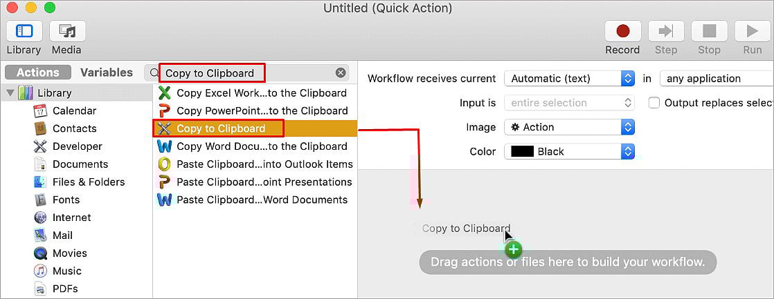 Tekan Command + Spasi untuk membuka Spotlight.Telusuri dan buka Automator.Aktif jendela pop-up Pilih jenis untuk dokumen Anda, pilih Layanan dari daftar dan klik Pilih.Arahkan kursor ke bidang penelusuran dan telusuri Salin ke Papan Klip.Dari daftar hasil penelusuran, seret dan lepas Salin ke Papan Klip ke bagian tertentu di panel kanan.