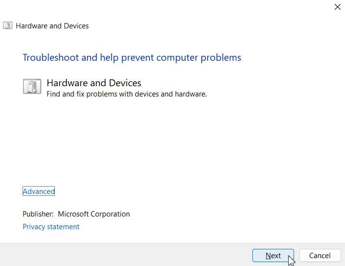 Untuk mendeteksi dan memecahkan masalah yang terkait dengan perangkat keras dan perangkat periferal lain yang terpasang ke komputer, Windows telah menyediakan pemecah masalah bawaan. Hal ini dapat secara otomatis memperbaiki masalah atau setidaknya menyarankan apa yang dapat dilakukan lebih lanjut.