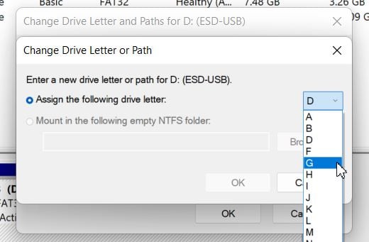 Perluas dropdown dan pilih Huruf lain untuk Flash drive Anda. Cobalah untuk menghindari C, D, dan E.