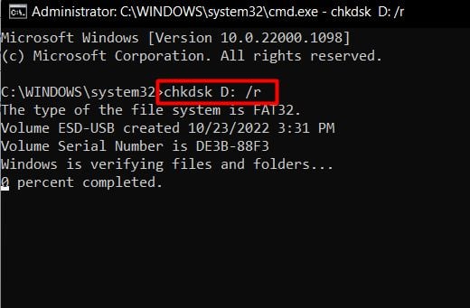 Jika Anda belum melakukannya, Anda dapat ubah huruf drive dengan mengikuti langkah-langkah di atas. Kemudian, lakukan pemecah masalah baris perintah chkdsk Windows untuk memperbaiki masalah logis dan bad sector flash drive Anda. Langkah-langkah untuk menjalankan perintah tercantum di bawah ini:
