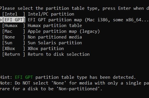 Pilih flash drive Anda dari list menggunakan tombol panah atas/bawah, dan tekan Enter untuk memilihnya.Pilih dan pilih jenis tabel Partisi atau biarkan yang terdeteksi.