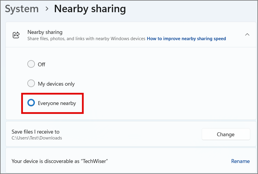 2. Secara default, Berbagi Langsung dinonaktifkan. Klik Semua orang di sekitaruntuk AKTIFKAN di kedua PC dan dapat dilihat oleh semua orang di jaringan yang sama.