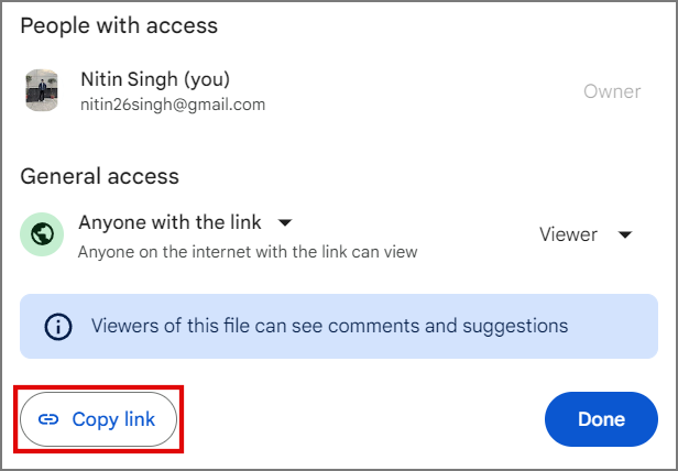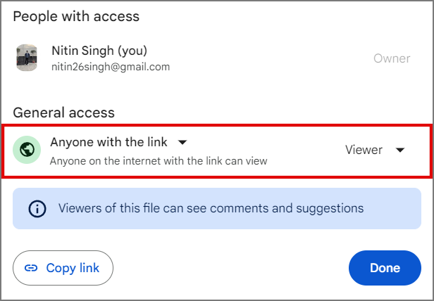 5. Ubah izin menjadi Siapa pun yang memiliki tautan dan tetapkan izin akses sebagai Penampil atau Editor.