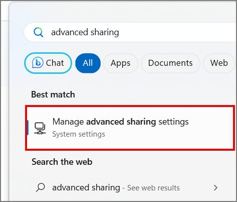 1. Telusuri Berbagi lanjutan dari ikon penelusuran di bilah tugas dan ketuk Kelola setelan berbagi lanjutan.