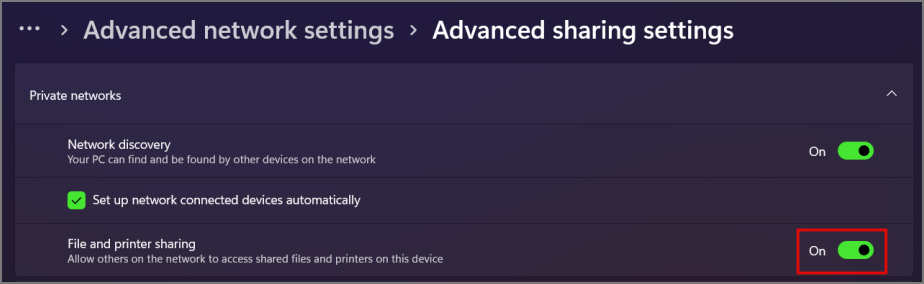 2. Aktifkan Berbagi file dan printer di bagian jaringan pribadi.