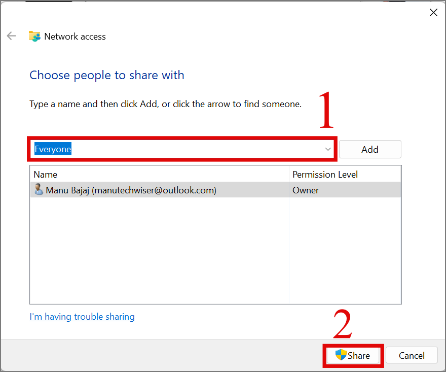 5. Pilih file atau folder untuk dibagikan dan biarkan mencari perangkat Windows Anda di sekitar.