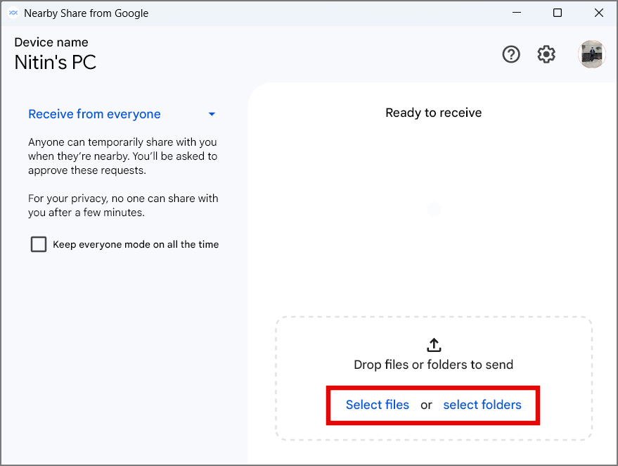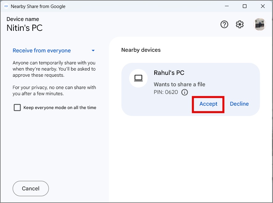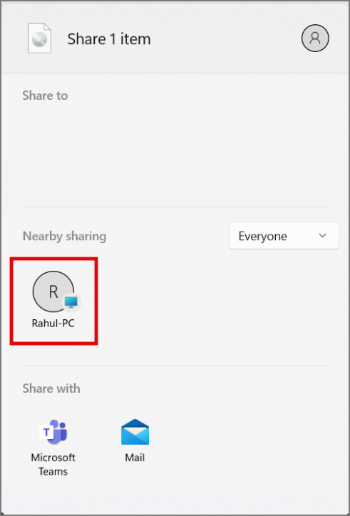 5. Jendela pop-up akan terbuka dengan opsi berbagi terdekat dan secara otomatis akan mendeteksi komputer Windows mana pun di jaringan yang sama.