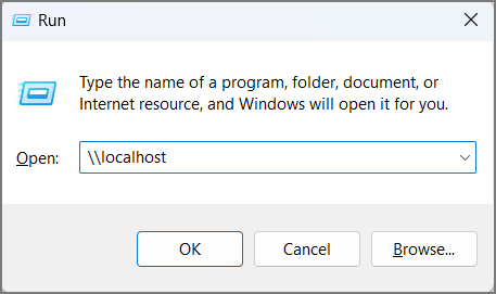 8. Pada PC kedua, klik Windows + R untuk membuka kotak dialog Run, lalu ketikkan \\localhost.
