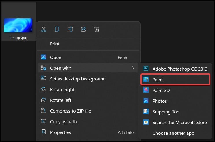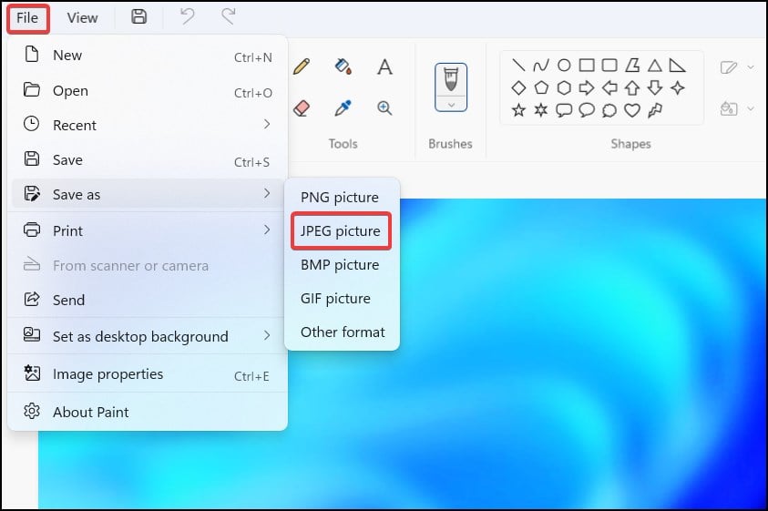 Klik kanan pada gambar dan klik Buka denganDari menu, pilih PaintDi dalam Paint, klik File dari Bilah Alat dan pilih Simpan sebagai